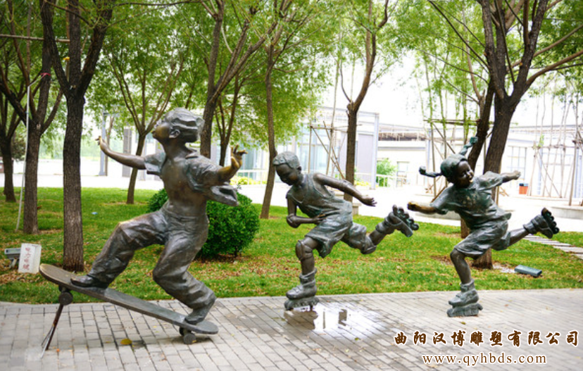 玻璃钢仿铜雕塑-城市景观园林雕塑厂家-小孩滑旱冰雕塑价格