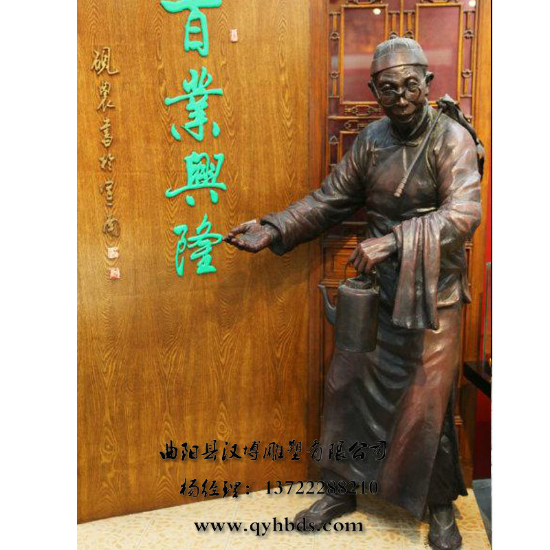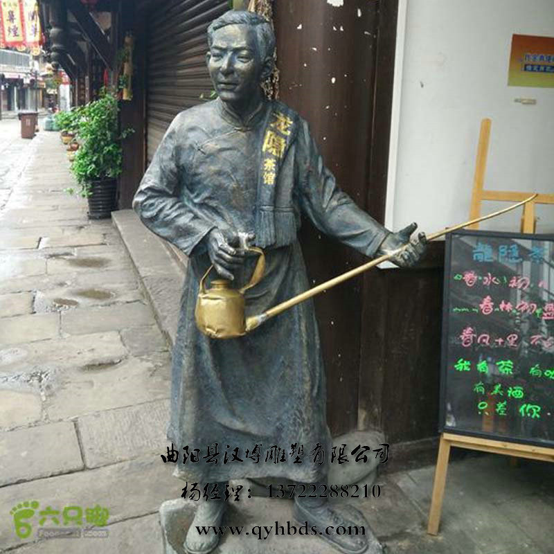 创意仿铜玻璃钢雕塑 茶叶店伙计人物雕塑 户外餐馆迎宾人物雕塑