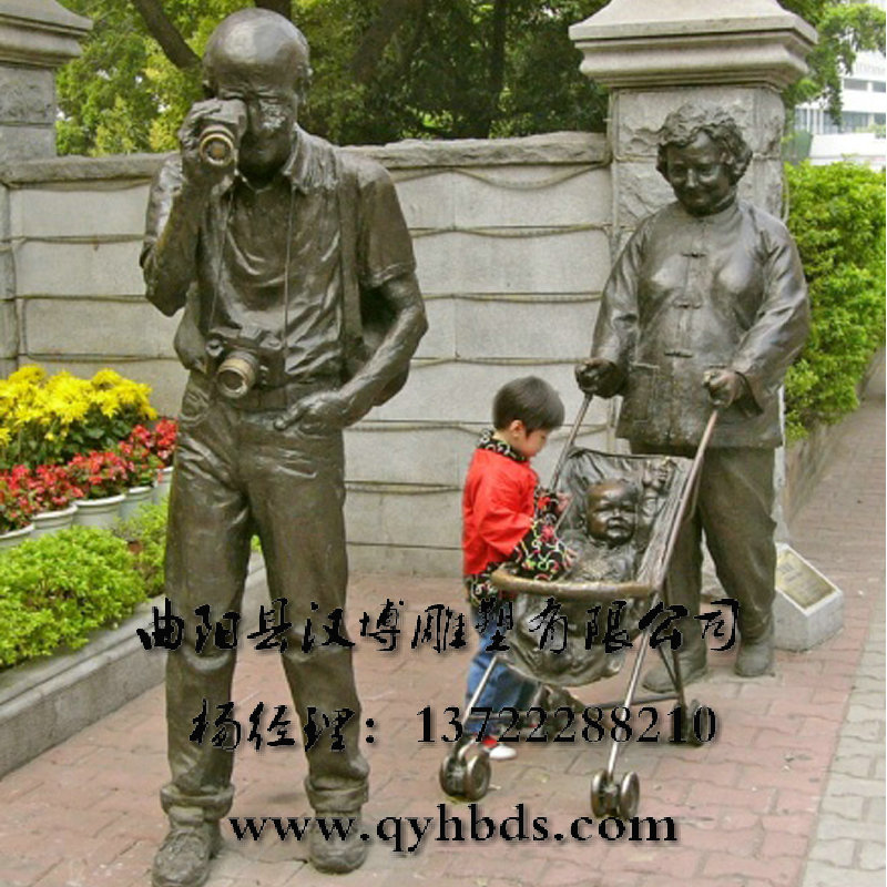 玻璃钢铸铜人物雕塑 一家三口街拍拍照情景 景观雕塑广场公园