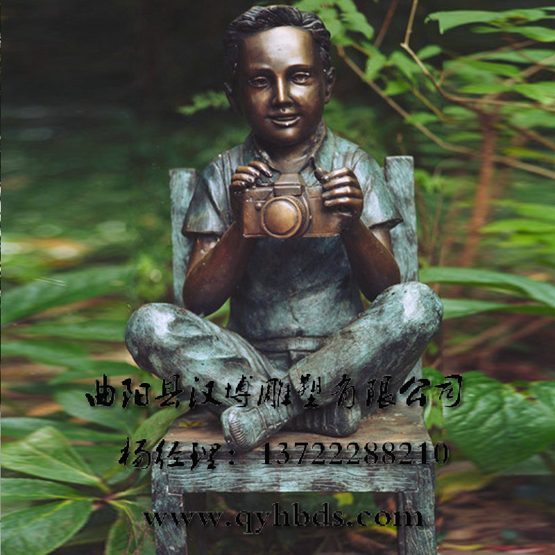 玻璃钢仿铜雕塑 小孩拿照相机人物雕塑 公园景观雕塑