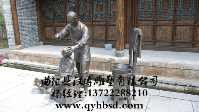 玻璃钢仿铜老北京人物,街头理发人物雕像